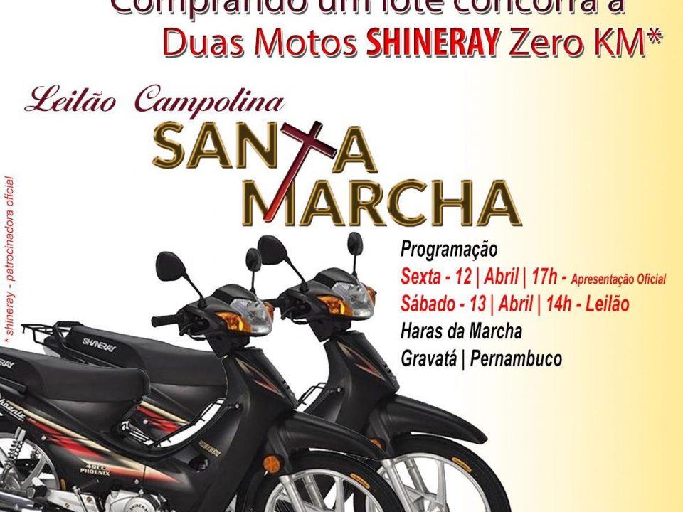 Comprando um lote no leilão Santa Marcha você pode ganhar uma moto Shineray. Sai montado em duas máquinas.